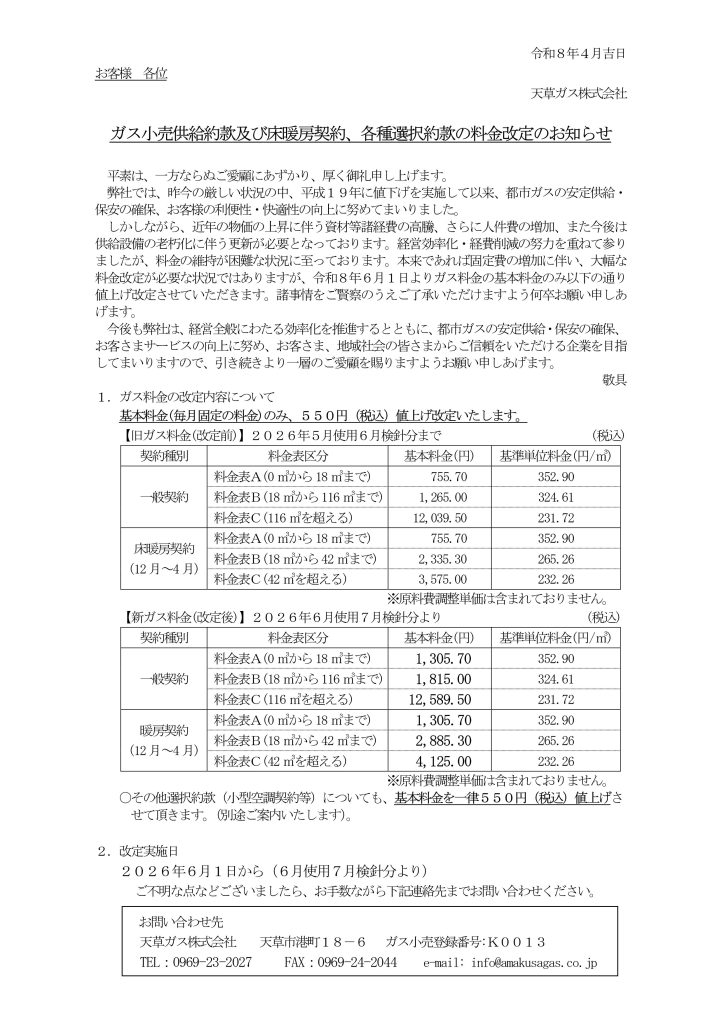 ガス小売供給約款及び床暖房契約、各種選択約款の料金改定のお知らせ